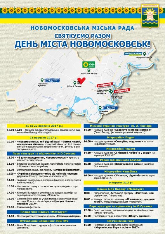 - 11:00 «З днем народження, Новомосковськ!» Урочисте відкриття святкування;