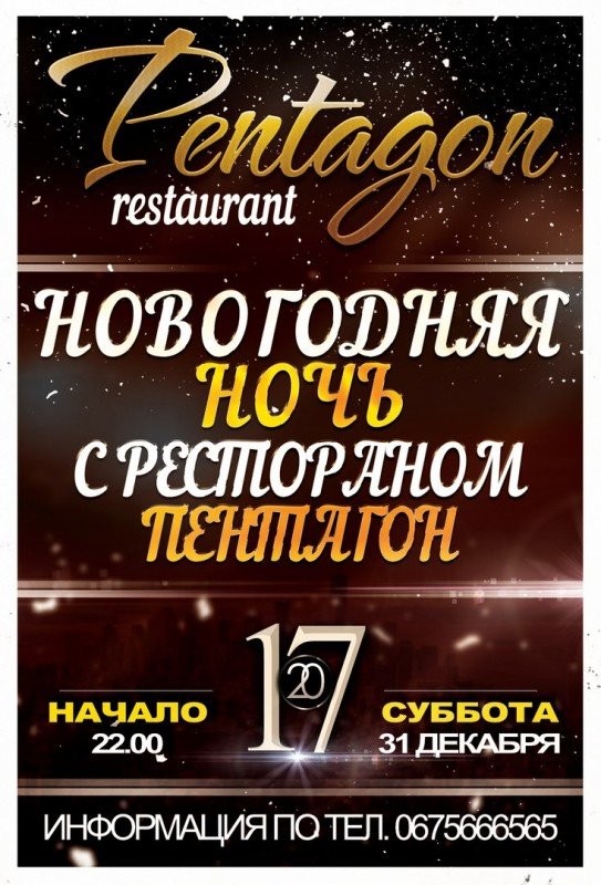Pentagon открывает свои объятие в Новогоднюю Ночь 2017 , не знаешь где отдохнуть в эту ночь ? Именно 31 декабря в 24:00 сбудутся твои мечты в Pentagon . Мы подарим яркие воспоминания , вспомним как прошел твой 2016 год .