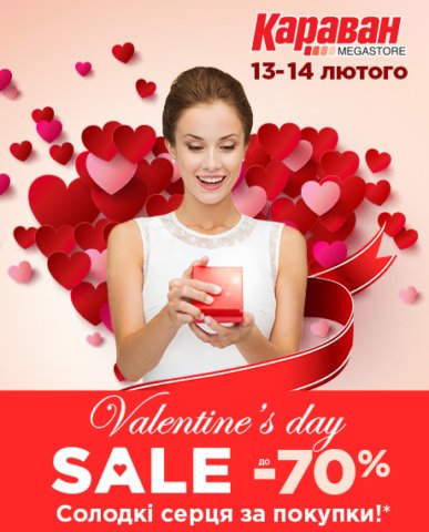 Совершив покупки 14 февраля с 10:00 до 20:00 одним чеком на сумму от 200 грн, вы гарантировано получаете в подарок «Сладкое сердце». Всем желающим необходимо зарегистрироваться у промоутера на инфостойке на 1-м этаже напротив магазина Глория Джинс.