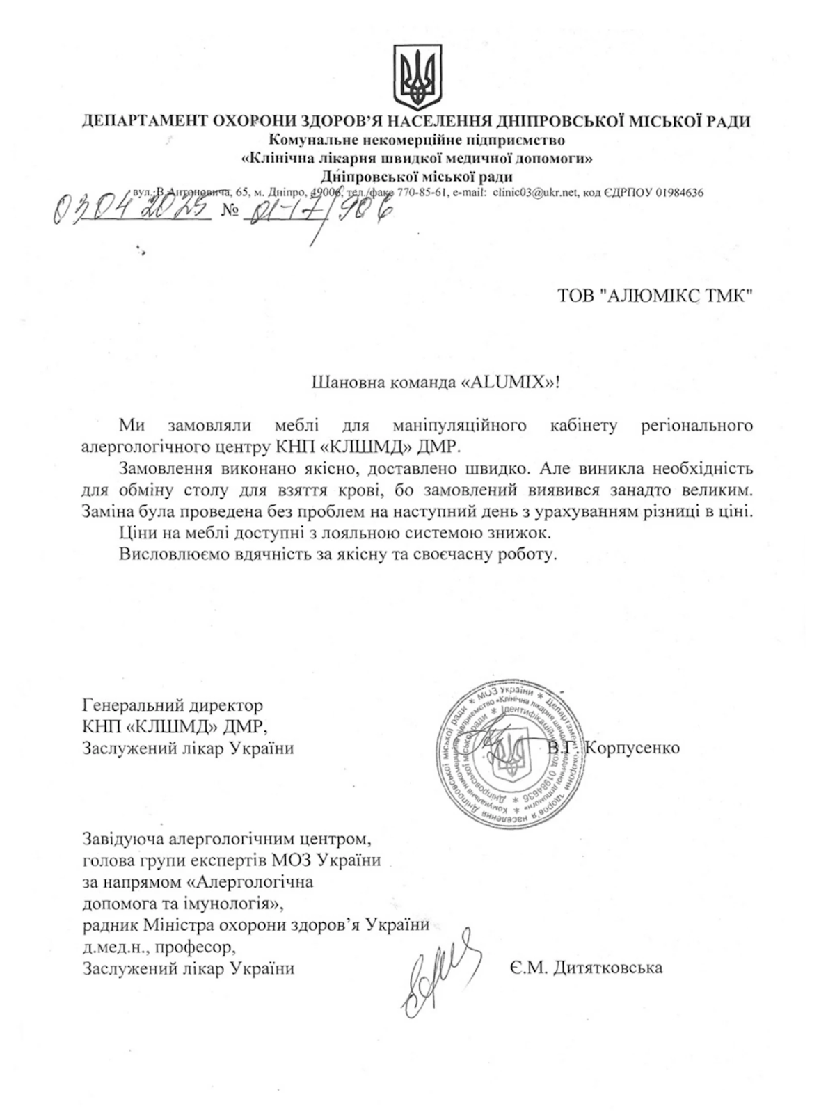 Відгук лікарні для українського виробника "Алюмікс ТМК"