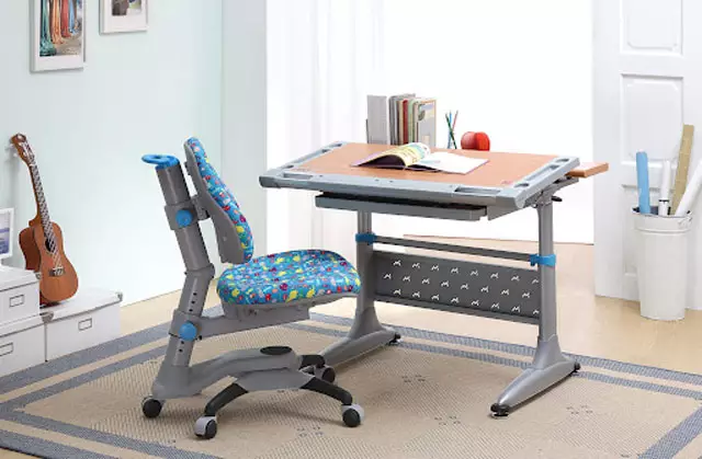 Колени и локти — около 90°. Спина касается спинки стула, стопы уверенно стоят на полу (или на подставке). Стол — 52–58 см для младших, 60–75 см для старших (ориентируйтесь на рост).