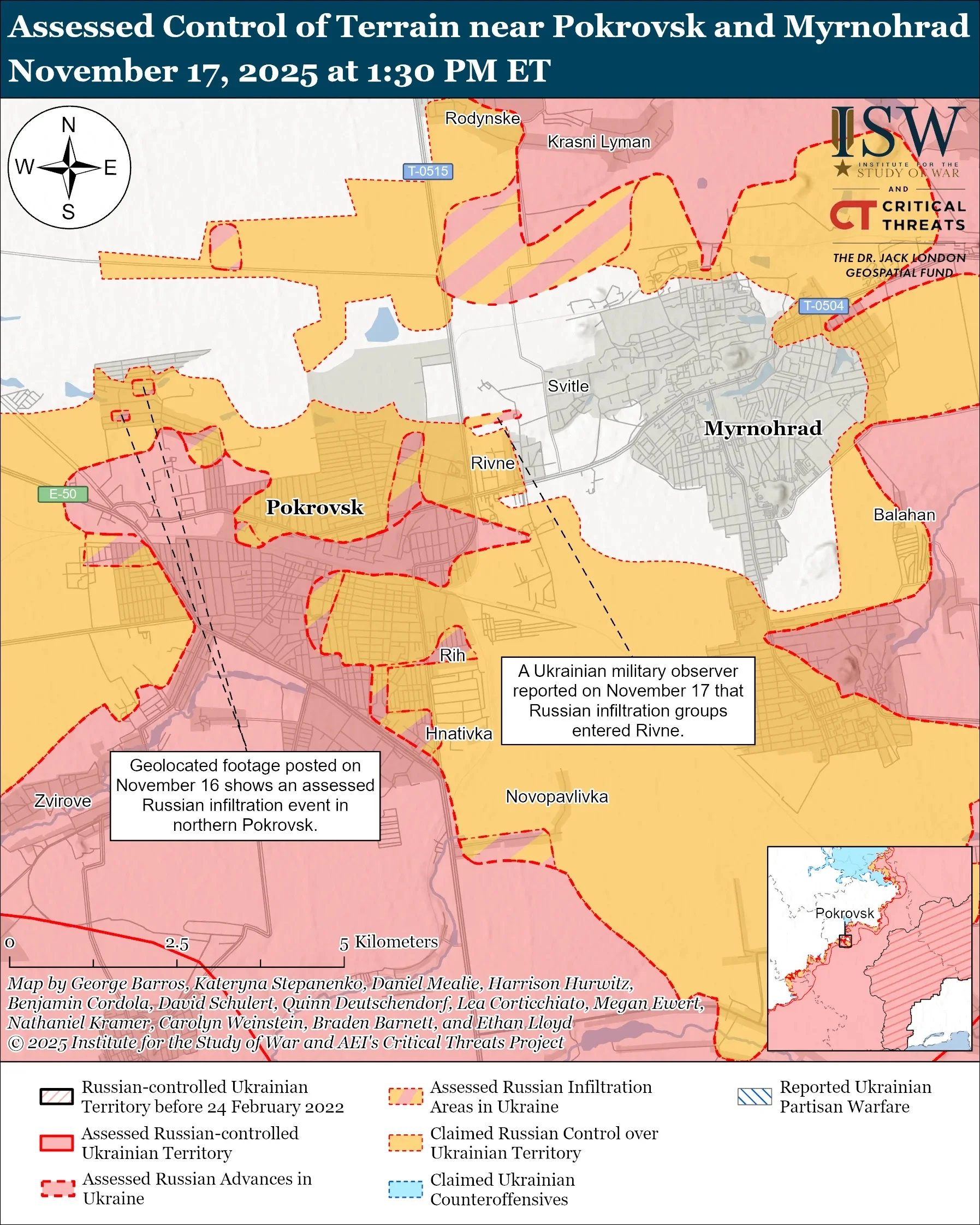 Російські війська, ймовірно, намагаються утримати ЗСУ всередині Покровська, водночас оточуючи українські війська в покровсько-мирноградській«кишені» із заходу. Про це йдеться у зведенні Інституту вивчення війни(ISW) за 17 листопада.